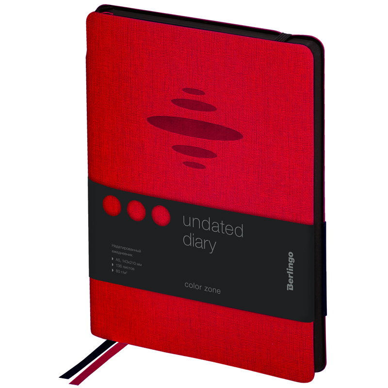 Стильный недатированный ежедневник Berlingo Color Zone формата А5 с ультрамягкой обложкой из экокожи. Обложка с тиснением красного цвета ярко контрастирует с черным срезом. Для удобства внутри корешка расположен специальный карман для ручки, ежедневник можно зафиксировать вертикальной резинкой. Внутренний блок состоит из 136 листов высококачественной кремовой бумаги повышенной плотности 80 г/м² с пантонной печатью в 2 краски. Недатированный ежедневник Berlingo Color Zone представлен в размере 143 на 210 мм.