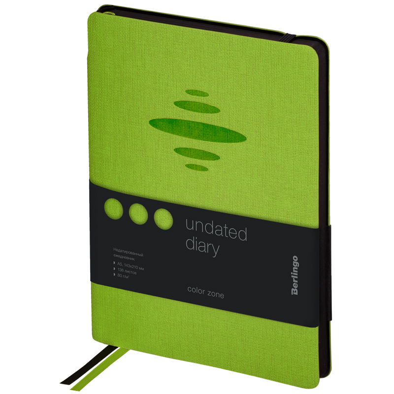 Стильный недатированный ежедневник Berlingo Color Zone формата А5 с ультрамягкой обложкой из экокожи. Салатовый цвет обложки с тиснением ярко контрастирует с черным срезом. Для удобства внутри корешка расположен специальный карман для ручки, ежедневник можно зафиксировать вертикальной резинкой. Внутренний блок состоит из 136 листов высококачественной кремовой бумаги повышенной плотности 80 г/м² с пантонной печатью в 2 краски. Недатированный ежедневник Berlingo Color Zone представлен в размере 143 на 210 мм.