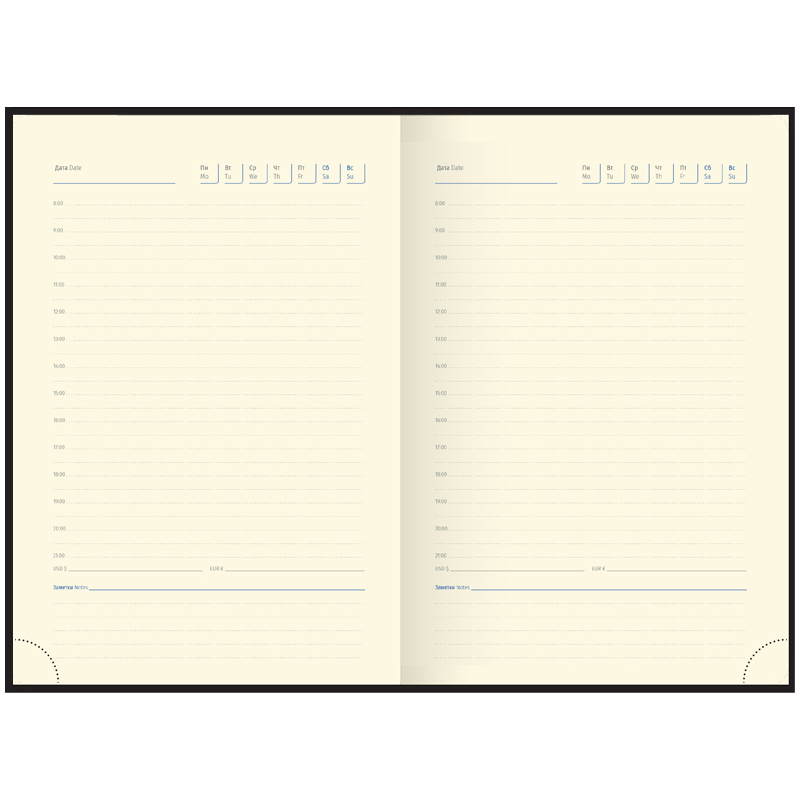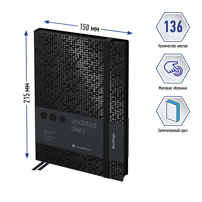Стильные ежедневники Berlingo "DoubleBlack" с полужесткой обложкой из высококачественного soft-touch кожзаменителя с черным срезом. Вертикальная фиксирующая резинка увеличенной толщины 9мм. Цвет обложки - черный. Имиджевый рисунок лаком по всей площади обложки. Внутренний карман для хранения заметок и мелочей. Внутренний блок из 136 листов высококачественной кремовой бумаги повышенной плотности 80 г/м², пантонная печать в 2 краски, справочный материал. Перфорированные уголки блока. 2 закладки-ляссе. Отрывные заметки и бланки извещения о ДТП. Прошитый блок. Подходит под персонализацию.