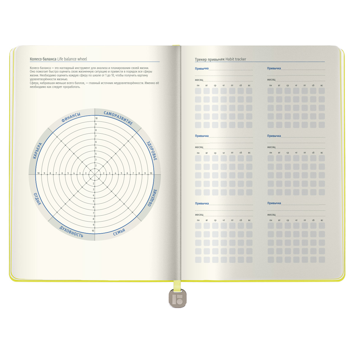 Внутренний блок состоит из 136 листов кремовой бумаги повышенной плотности 80 г/м² с пантонной печатью в две краски. Размер ежедневника — 155*213 мм. Обновлённый блок включает разделы для организации рабочего времени и систематизации личных планов, а также мотивирующие цитаты на каждый день. Раздел с постановкой годовых целей с разбивкой на этапы помогает сохранять фокус на самом важном. От.дельный блок отрывных листов предназначен для заметок, а дополнительный внутренний конверт — для хранения важных записей.