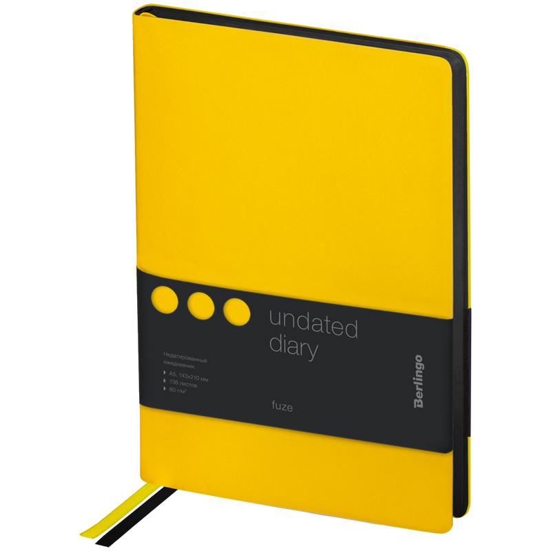 Стильный недатированный ежедневник Berlingo Fuze формата А5 с ультрамягкой обложкой из экокожи. Обложка желтого цвета ярко контрастирует с черным срезом. Внутренний блок состоит из 136 листов высококачественной кремовой бумаги повышенной плотности 80 г/м² с пантонной печатью в 2 краски. Недатированный ежедневник Berlingo Fuze представлен в размере 143 на 210 мм.