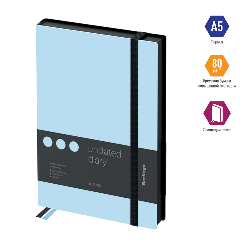 Стильный недатированный ежедневник Berlingo Instinct формата А5 с ярким цветным контрастным срезом и ультрамягкой обложкой из высококачественной экокожи. Яркий аквамариновый цвет обложки создаёт эффектный контраст с черным цветом среза. Внутренний блок состоит из 136 листов высококачественной кремовой бумаги повышенной плотности 80 г/м² с пантонной печатью в 2 краски. Недатированный ежедневник Berlingo Instinct представлен в размере 143 на 210 мм.