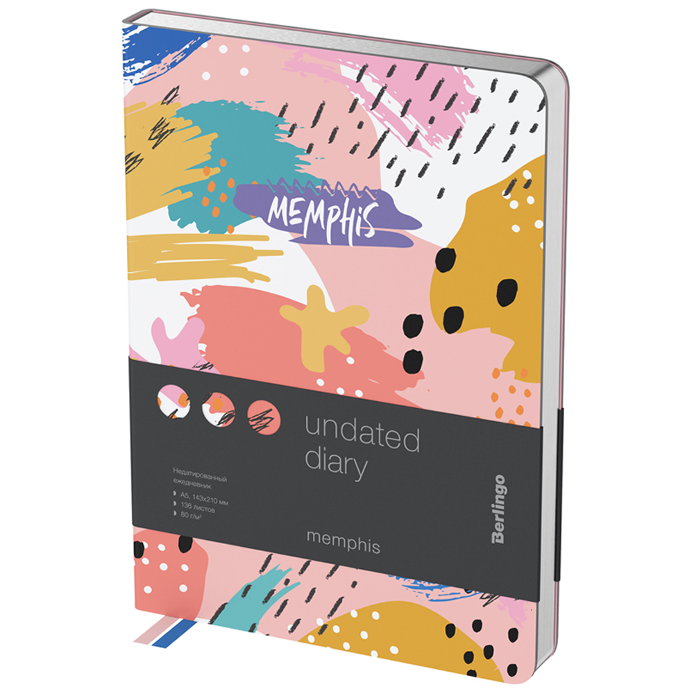 Стильный недатированный ежедневник Berlingo Memphis формата A5 с серебристым фольгированным контрастным срезом и ультрамягкой обложкой из высококачественной экокожи. Яркий дизайн коллекционной серии Berlingo Memphis. Внутренний блок состоит из 136 листов высококачественной кремовой бумаги повышенной плотности 80 г/м² с пантонной печатью в 2 краски. Представлен в размере 143 на 210 мм.