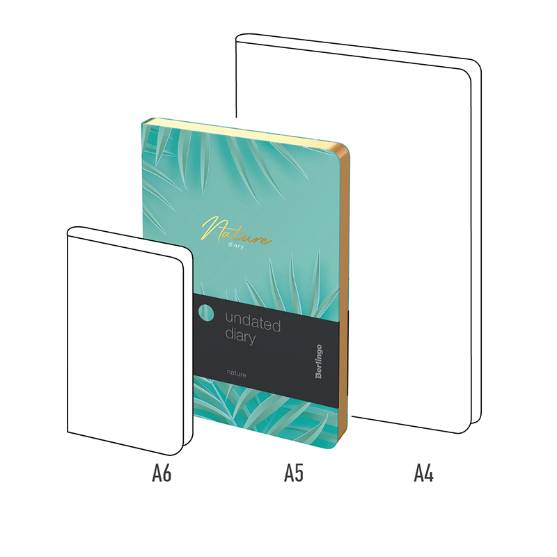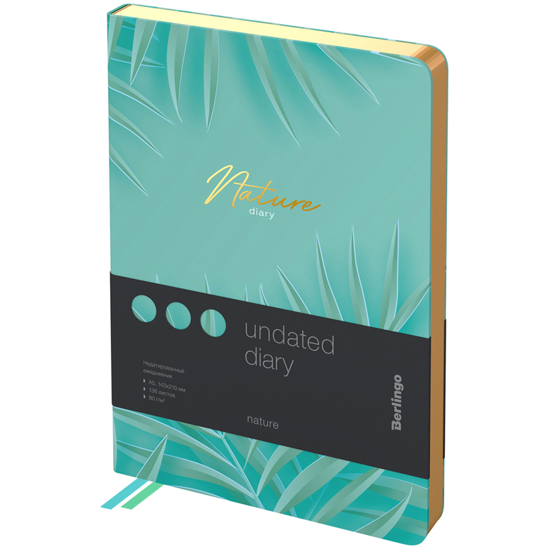 Недатированные ежедневники Berlingo "Nature" в мягкой обложке из искусственной кожи с дизайном. Золотой срез блока. Внутренний блок из 136 листов высококачественной кремовой бумаги повышенной плотности 80 г/м², пантонная печать в 2 краски, справочный материал и перфорированные уголки. Две закладки-ляссе. Отрывные заметки, бланки извещения о ДТП и справочные материалы. 3 комплекта стикеров станут приятным подарком. Индивидуальная упаковка. Подходят под персонализацию
