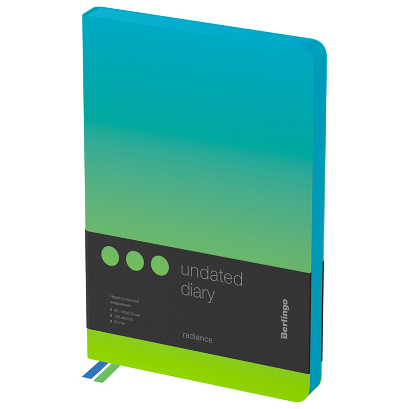 Стильный недатированный ежедневник Berlingo Radiance формата A5 с ярким цветным контрастным срезом и ультрамягкой обложкой из высококачественной экокожи. Насыщенный зелено-голубой градиент стильно сочетается с голубым срезом. Внутренний блок состоит из 136 листов высококачественной кремовой бумаги повышенной плотности 80 г/м² с пантонной печатью в 2 краски. Недатированный ежедневник Berlingo Radiance представлен в размере 143 на 210 мм.