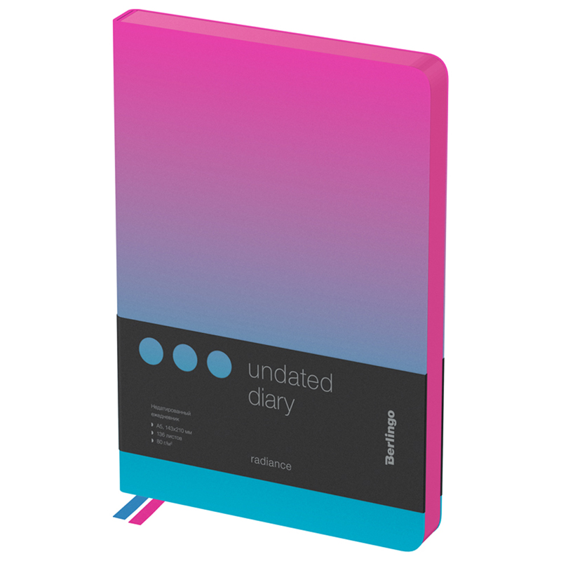 Стильный недатированный ежедневник Berlingo Radiance формата A5 с ярким цветным контрастным срезом и ультрамягкой обложкой из высококачественной экокожи. Насыщенный розово-голубой градиент стильно сочетается с розовым срезом. Внутренний блок состоит из 136 листов высококачественной кремовой бумаги повышенной плотности 80 г/м² с пантонной печатью в 2 краски. Недатированный ежедневник Berlingo Radiance представлен в размере 143 на 210 мм.