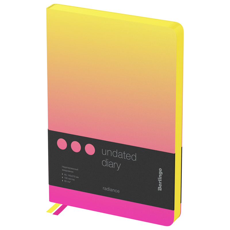 Стильный недатированный ежедневник Berlingo Radiance формата A5 с ярким цветным контрастным срезом и ультрамягкой обложкой из высококачественной экокожи. Насыщенный розово-желтый градиент стильно сочетается со срезом желтого цвета. Внутренний блок состоит из 136 листов высококачественной кремовой бумаги повышенной плотности 80 г/м² с пантонной печатью в 2 краски. Недатированный ежедневник Berlingo Radiance представлен в размере 143 на 210 мм.