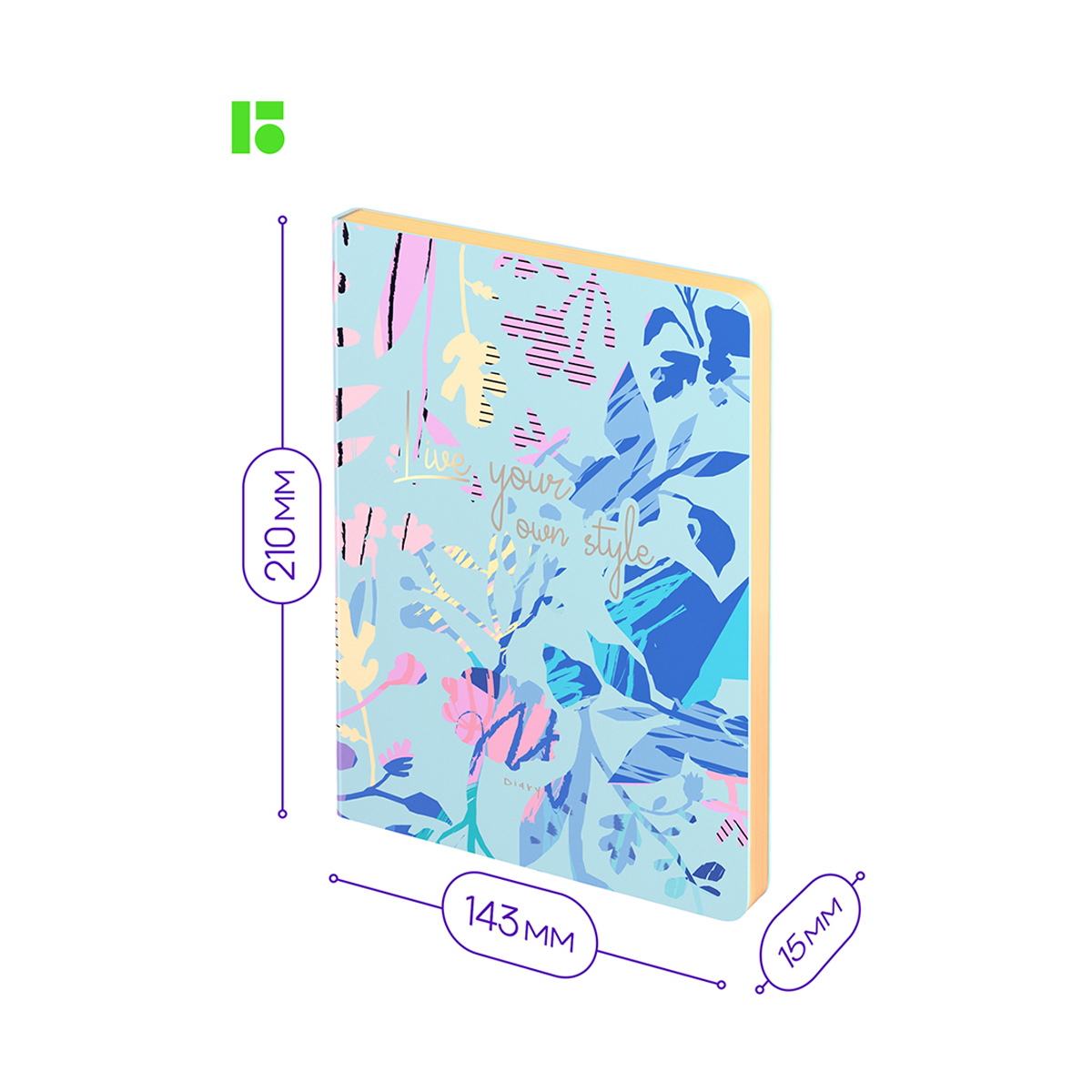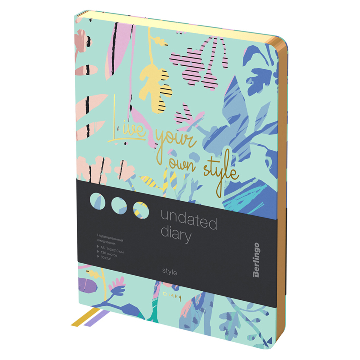 Недатированные ежедневники Berlingo "Style" в мягкой обложке из искусственной кожи с ярким дизайном. Мятный цвет фона обложки. Фольгированные элементы дизайна на обложке. Золотой срез блока. Внутренний блок из 136 листов высококачественной кремовой бумаги повышенной плотности 80 г/м², пантонная печать в 2 краски, справочный материал и перфорированные уголки. Две закладки-ляссе. Отрывные заметки, бланки извещения о ДТП и справочные материалы. 3 комплекта стикеров станут приятным подарком. Индивидуальная упаковка. Подходят под персонализацию