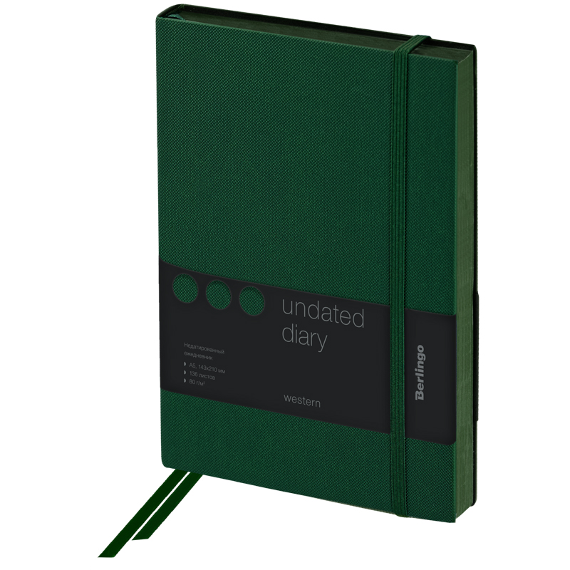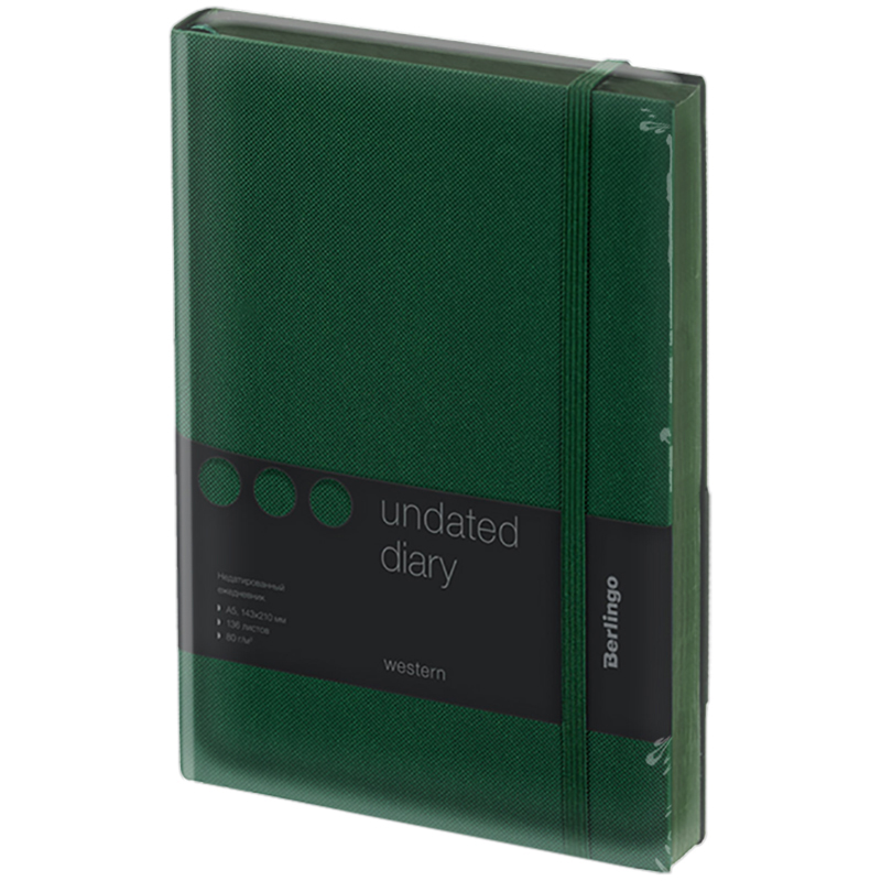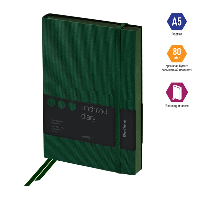 Изящный недатированный ежедневник Berlingo Western формата А5 с полужесткой обложкой из экокожи со стильным тиснением под карбон идеален для повседневного использования. Срез в цвет зеленой обложки приятно сочетается с общим оформлением ежедневника. Внутренний блок состоит из 136 листов высококачественной кремовой бумаги повышенной плотности 80 г/м² с пантонной печатью в 2 краски. Размер недатированного ежедневника – 143 на 210 мм.