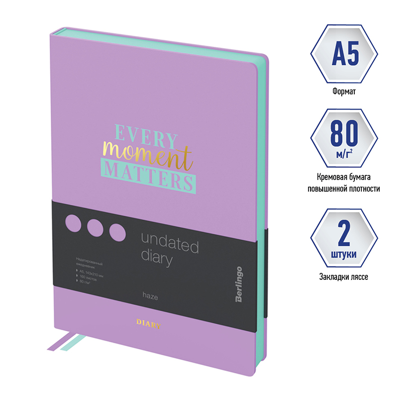 Недатированные ежедневники Berlingo "Haze" в твердой обложке с поролоновой подкладкой из искусственной кожи сиреневого цвета с дизайном. Софт-тач материал обложки. Мятный срез блока. Внутренний блок из 160 листов высококачественной кремовой бумаги повышенной плотности 80 г/м², пантонная печать в 2 краски, справочный материал и перфорированные уголки. Две закладки-ляссе. Отрывные заметки, бланки извещения о ДТП и справочные материалы. 3 комплекта стикеров станут приятным подарком. Индивидуальная упаковка. Подходят под персонализацию