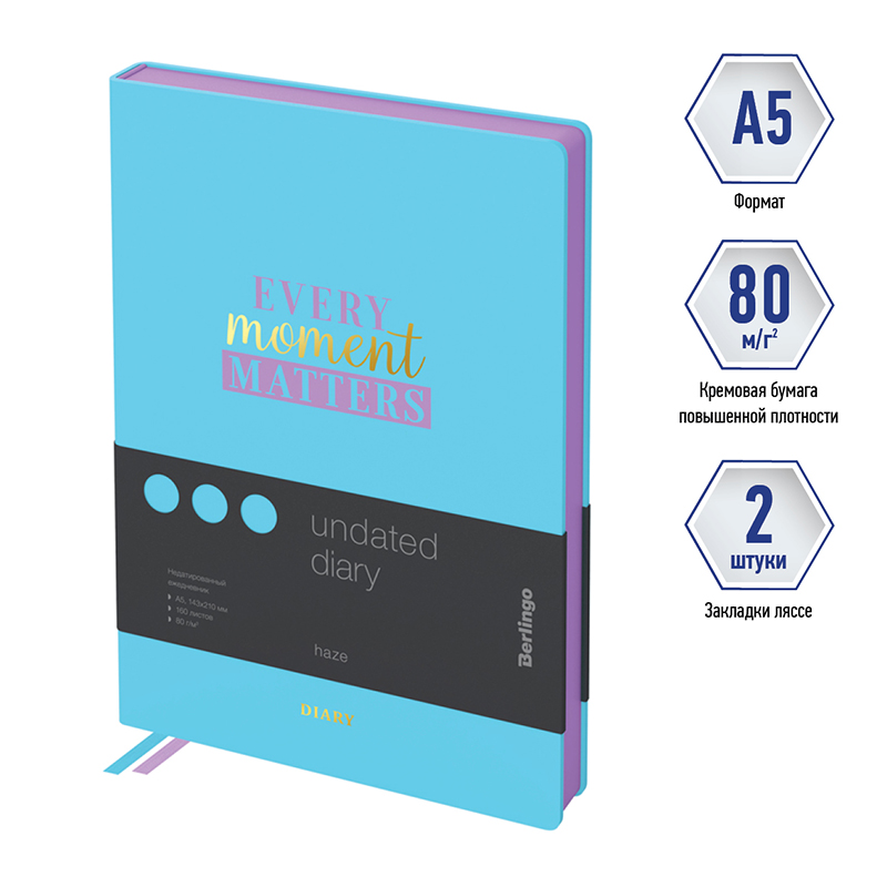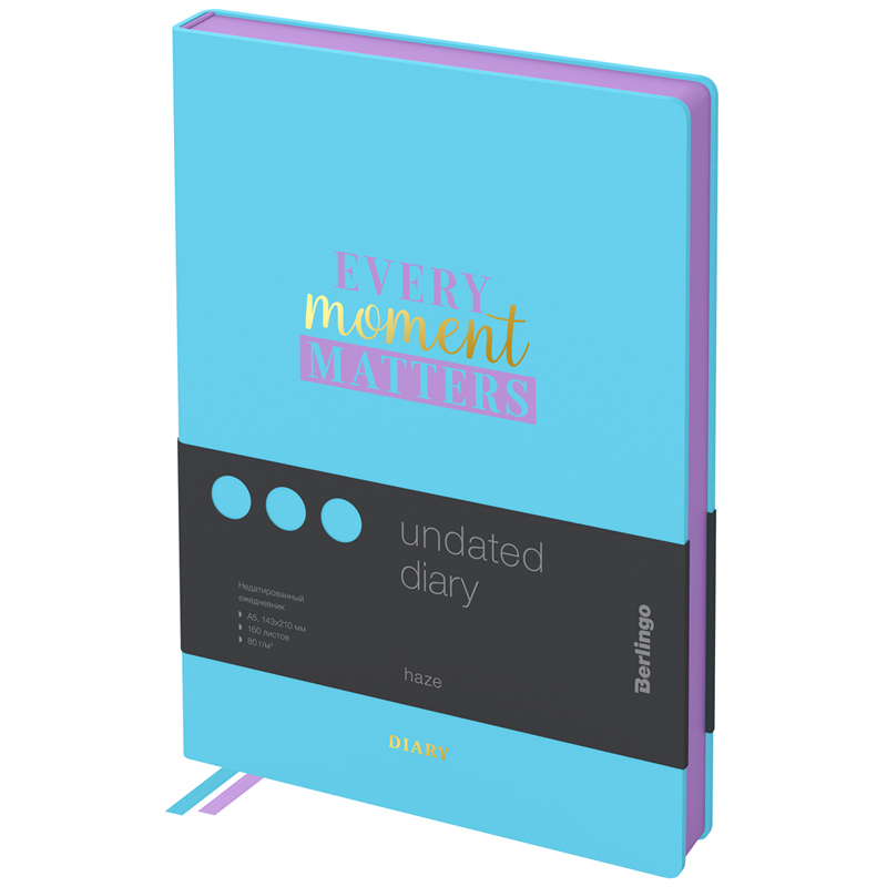 Недатированные ежедневники Berlingo "Haze" в твердой обложке с поролоновой подкладкой из искусственной кожи голубого цвета с дизайном. Софт-тач материал обложки. Сиреневый срез блока. Внутренний блок из 160 листов высококачественной кремовой бумаги повышенной плотности 80 г/м², пантонная печать в 2 краски, справочный материал и перфорированные уголки. Две закладки-ляссе. Отрывные заметки, бланки извещения о ДТП и справочные материалы. 3 комплекта стикеров станут приятным подарком. Индивидуальная упаковка. Подходят под персонализацию.
