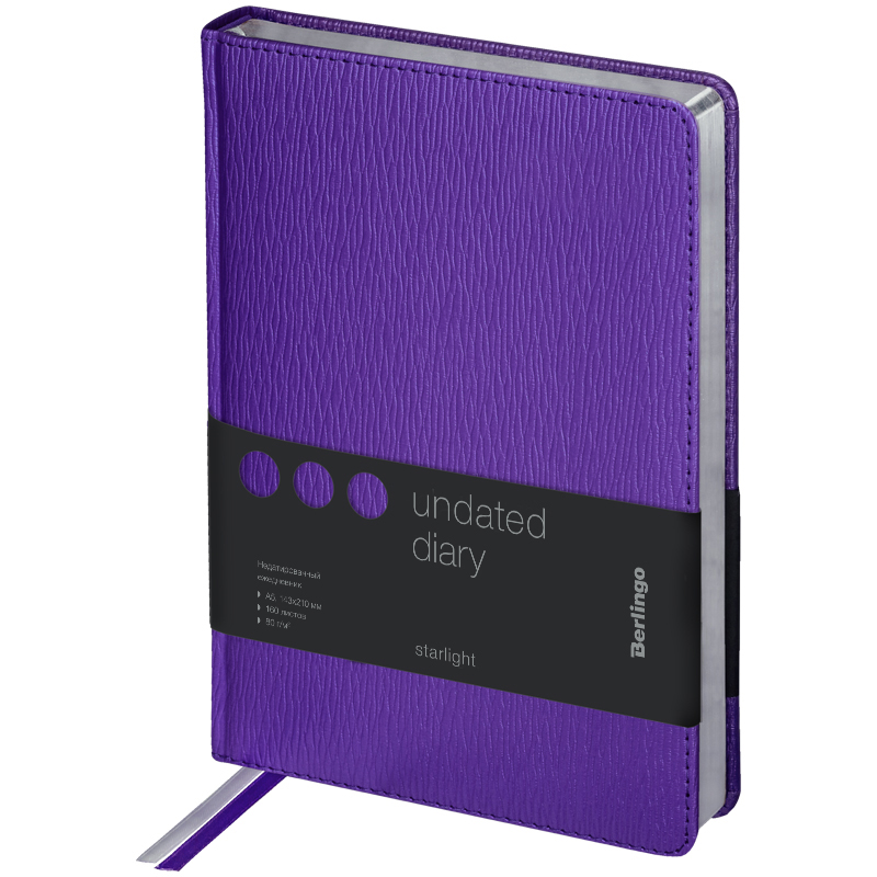 Оригинальный недатированный ежедневник Berlingo Starlight формата А5 с твердой блестящей обложкой из экокожи и поролоновой прослойкой идеально подойдет в качестве подарка. Серебряный фольгированный срез красиво подчеркивает яркий фиолетовый цвет обложки с продольной текстурой. Внутренний блок состоит из 160 листов высококачественной кремовой бумаги повышенной плотности 80 г/м² с пантонной печатью в 2 краски. Размер недатированного ежедневника – 150 на 215 мм.