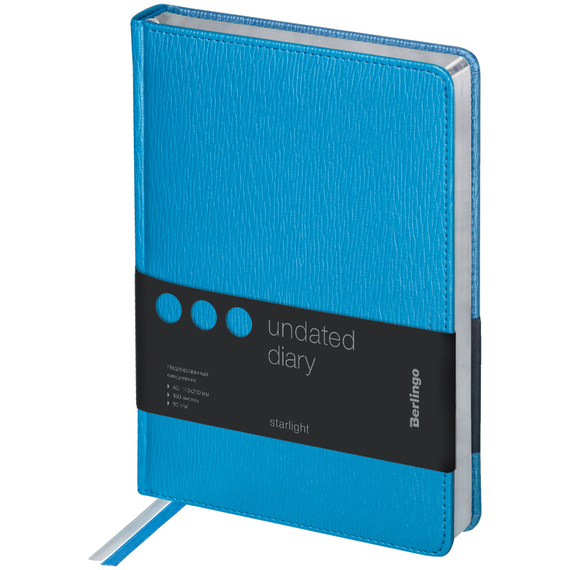 Оригинальный недатированный ежедневник Berlingo Starlight формата А5 с твердой блестящей обложкой из экокожи и поролоновой прослойкой идеально подойдет в качестве подарка. Серебряный фольгированный срез красиво подчеркивает нежный голубой цвет обложки с продольной текстурой. Внутренний блок состоит из 160 листов высококачественной кремовой бумаги повышенной плотности 80 г/м² с пантонной печатью в 2 краски. Размер недатированного ежедневника – 150 на 215 мм.
