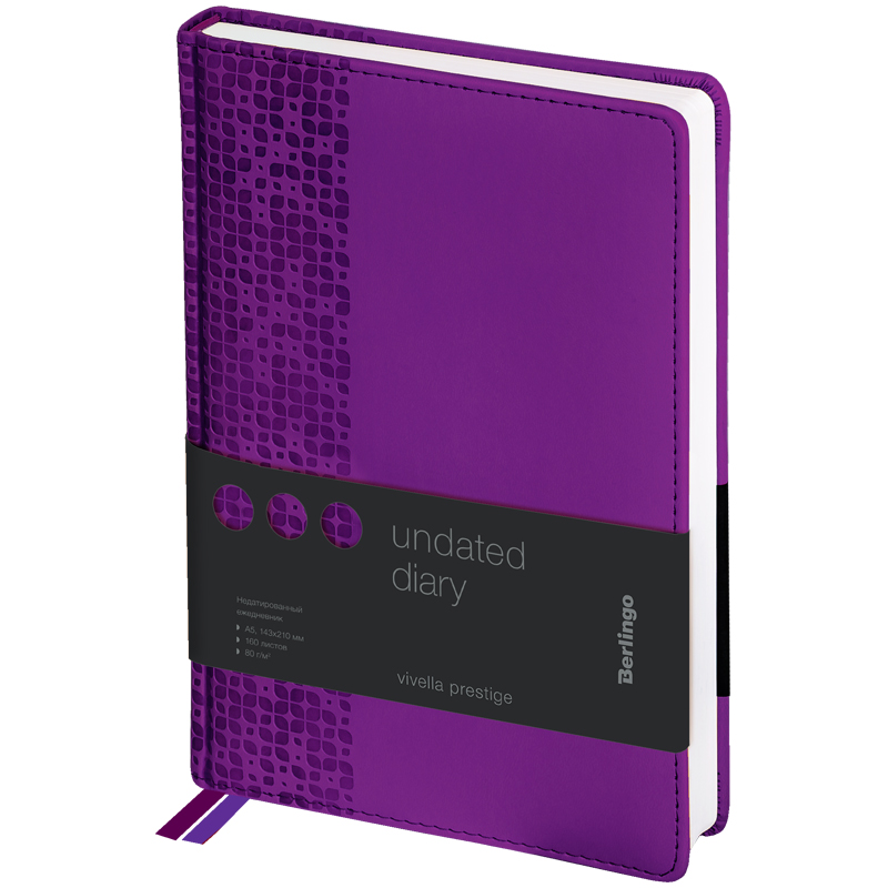 Стильный недатированный ежедневник Berlingo Vivella Prestige формата А5 с классической твердой матовой обложкой из высококачественной экокожи. Имиджевое тиснение на обложке добавляет интересную деталь в глубокий фиолетовый цвет. Внутренний блок состоит из 160 листов высококачественной белой бумаги повышенной плотности 80 г/м² с пантонной печатью в 2 краски. Недатированный ежедневник Berlingo Vivella Prestige представлен в размере 150 на 215 мм.