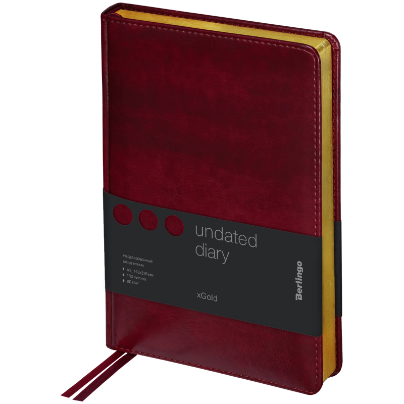 Оригинальный недатированный ежедневник Berlingo xGold формата А5 с твердой обложкой из экокожи и поролоновой прослойкой понравится каждому. Золотой фольгированный срез красиво подчеркивает насыщенный бордовый цвет обложки. Внутренний блок состоит из 160 листов высококачественной кремовой бумаги повышенной плотности 80 г/м² с пантонной печатью в 2 краски. Размер недатированного ежедневника – 150 на 215 мм.
