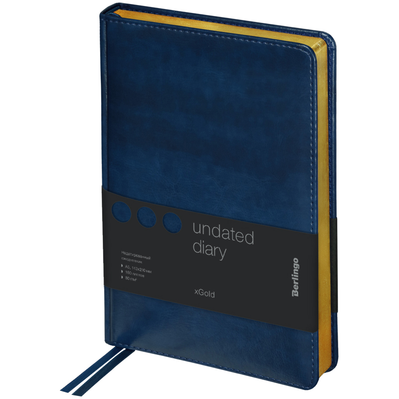 Оригинальный недатированный ежедневник Berlingo xGold формата А5 с твердой обложкой из экокожи и поролоновой прослойкой понравится каждому. Золотой фольгированный срез красиво подчеркивает глубокий синий цвет обложки. Внутренний блок состоит из 160 листов высококачественной кремовой бумаги повышенной плотности 80 г/м² с пантонной печатью в 2 краски. Размер недатированного ежедневника – 150 на 215 мм.