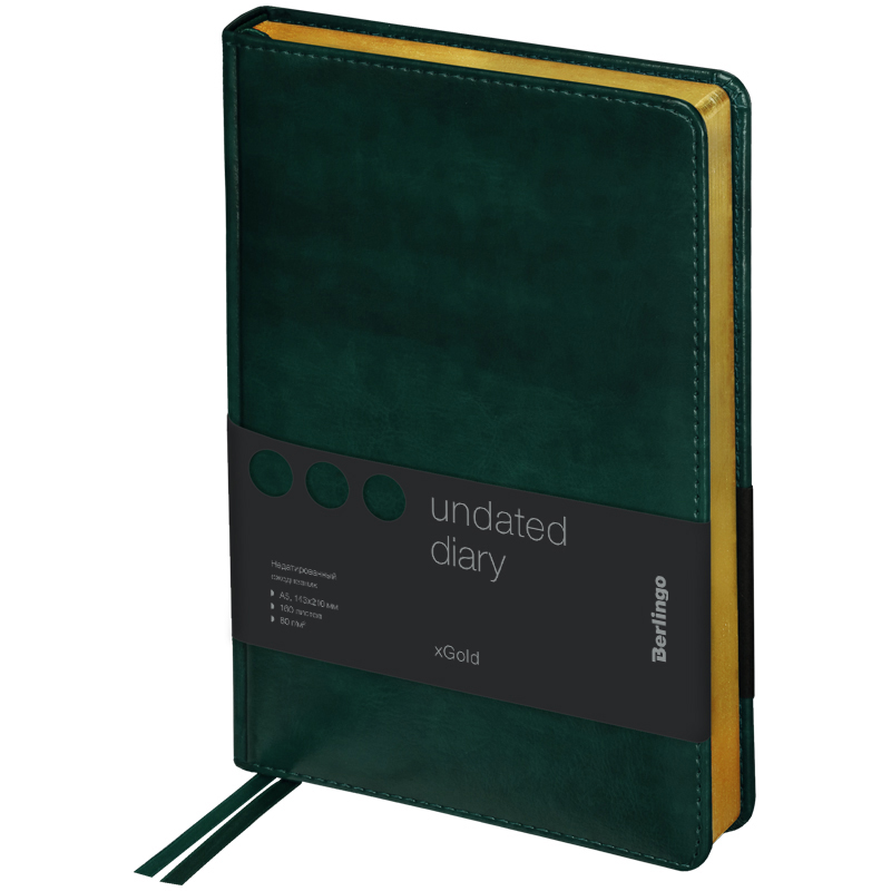 Оригинальный недатированный ежедневник Berlingo xGold формата А5 с твердой обложкой из экокожи и поролоновой прослойкой понравится каждому. Золотой фольгированный срез красиво подчеркивает глубокий зеленый цвет обложки. Внутренний блок состоит из 160 листов высококачественной кремовой бумаги повышенной плотности 80 г/м² с пантонной печатью в 2 краски. Размер недатированного ежедневника – 150 на 215 мм.