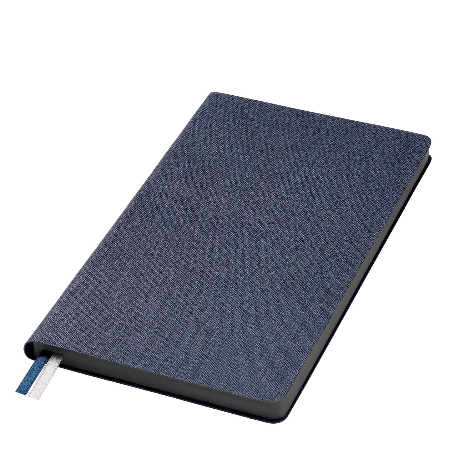 Недатированный ежедневник исполнен в холодной атмосферной тональности. Гибкая обложка из искусственной, слегка прорезиненной кожи со скругленными уголками. Рельефная фактура переплетного материала имитирует твид с характерным для этого вида шерстяной ткани мелким однородным плетением. Не блестит. Цвет – синий, динамичный, насыщенный, с более темными и светлыми вкраплениями, образуемыми за счет рельефа. Форзац и нахзац матовые, однородного серого цвета. Страницы со скругленными уголками кремового цвета из гладкого, слегка шелковистого офсета. Срез матовый, темно-серый. Двойное атласное ляссе составлено из лент синего и серого цветов, имеет легкий блеск. Ширина каждой ленты 6 мм. Упаковка: пластиковая коробка - есть