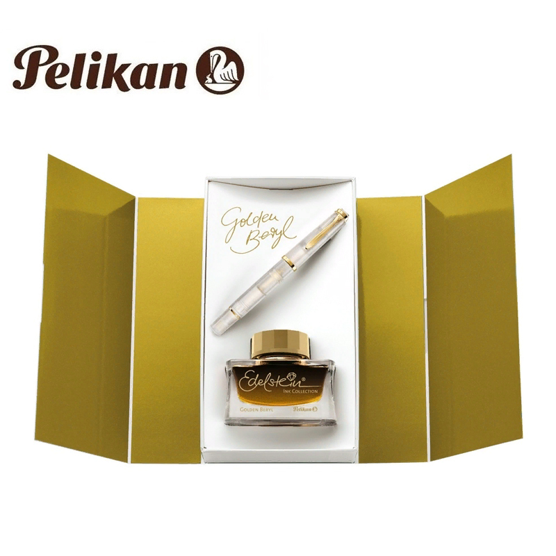 В этом году Pelikan снова предложил серию пишущих инструментов, соответствующих цвету последних чернил Edelstein® 2021 года - Golden Beryl. Это красивый полупрозрачный белый с кристаллами золотистого цвета, созданный благодаря драгоценному «золотому берилу». Новые пишущие инструменты соответствующего цвета сделаны со специальным кристаллическим эффектом, с помощью которого ручка блестит и искриться на свету. Все ручки уникальны, а новый сверкающий эффект обеспечивает им особый и неповторимый вид. Пишущие инструменты предлагаются в блестящей золотистой отделке и оснащены классическим клипом в виде клюва Pelikan. Тщательно отполированное перо из нержавеющей стали добавляет привлекательности каждой перьевой ручке. Серия Pelikan Classic 200 Golden Beryl Special Edition 2021 будет предлагаться в виде перьевой ручки с дифференциальным поршневым механизмом, а также в виде шариковой ручки с нажимным механизмом. В зависимости от индивидуального почерка и предпочтений можно выбрать ручку с шириной пера EF, F, M или B. Набор состоящий из перьевой ручки Pelikan Elegance Classic Demonstrator M 200 Special Edition 2021 и флакона, соответствующих по цвету чернил Edelstein Ink of the Year 2021 Golden Beryl - идеальный подарок.