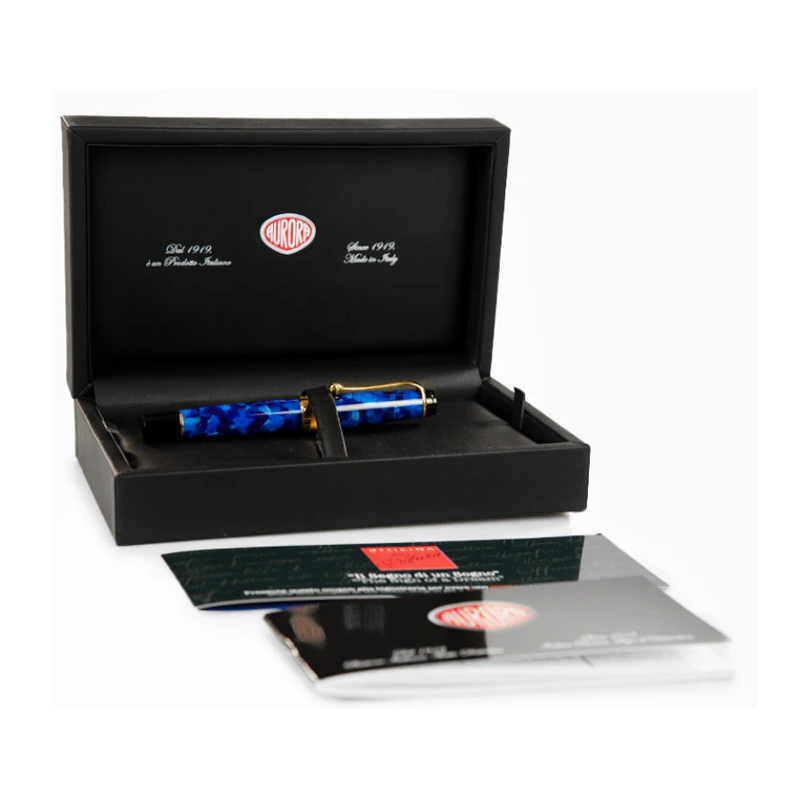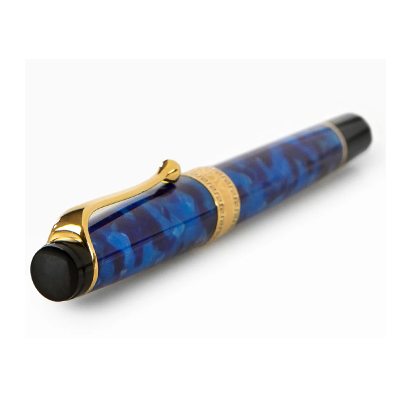 Ручка-роллер Aurora Optima Variegated blue Gold Plated Trim сделана из акриловой смолы. Отделка корпуса ручки выполнена золотом. Клип ручки покрыт золотом. Грип-секция ручки имеет резьбу для колпачка и покрыта лаком. На колпачке декоративное кольцо с греческим орнаментом. Ручка упакована в фирменную подарочную коробку. В комплекте имеется стержень-роллер.