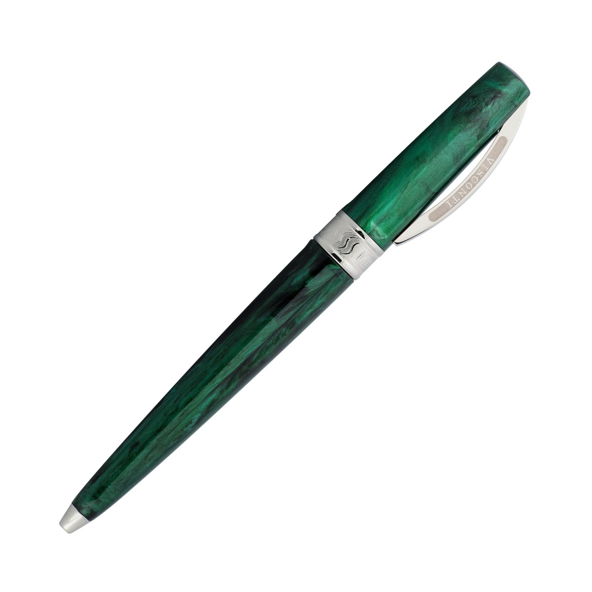 Мираж – магический оптический эффект зеркального отражения, который смешивает реальное и иллюзорное. Visconti предлагает прикоснуться к этому призрачному явлению, представляя необычную коллекцию пишущих инструментов Mirage. Шариковая ручка Mirage Emerald изготовлена из смолы темно-зеленого цвета, украшенной искусными лаконичными узорами, которые придают аксессуару ощущение жизни и движения. Плавные и гармоничные линии колпачка и барреля соединяются воедино в центре пишущего инструмента. Единственными контрастными элементами дизайна остаются культовый дугообразный клип Visconti и широкое металлическое кольцо колпачка, декорированное оригинальной гравировкой. Тонкие продольные канавки, чередующиеся на корпусе и колпачке ручки, заставляют свет и тени играть и переливаться на поверхности смолы, создавая иллюзорные образы. Металлические части ручки Mirage изготовлены из полированной латуни и покрыты блестящим палладием. Шариковый инструмент оснащается очень приятным поворотным механизмом с плавным ходом.